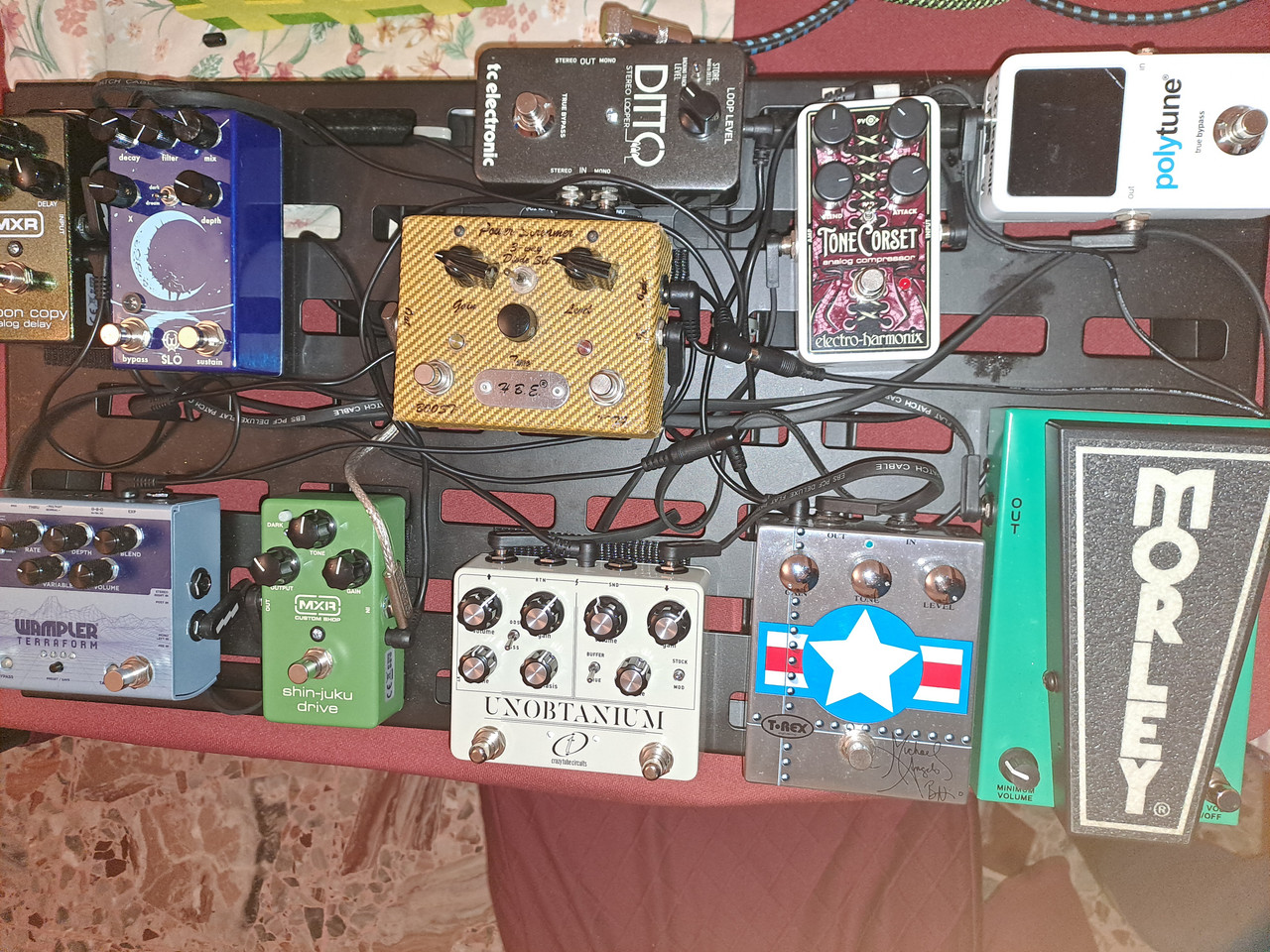 Bella, molto d'impatto, conosco pochi pedali tra quelli che hai, ma si vede che hai fatto un lavorone. Eh, vorrei anche io un conoscente che sappia mettere mano ai cablaggi e alla componente elettronica.